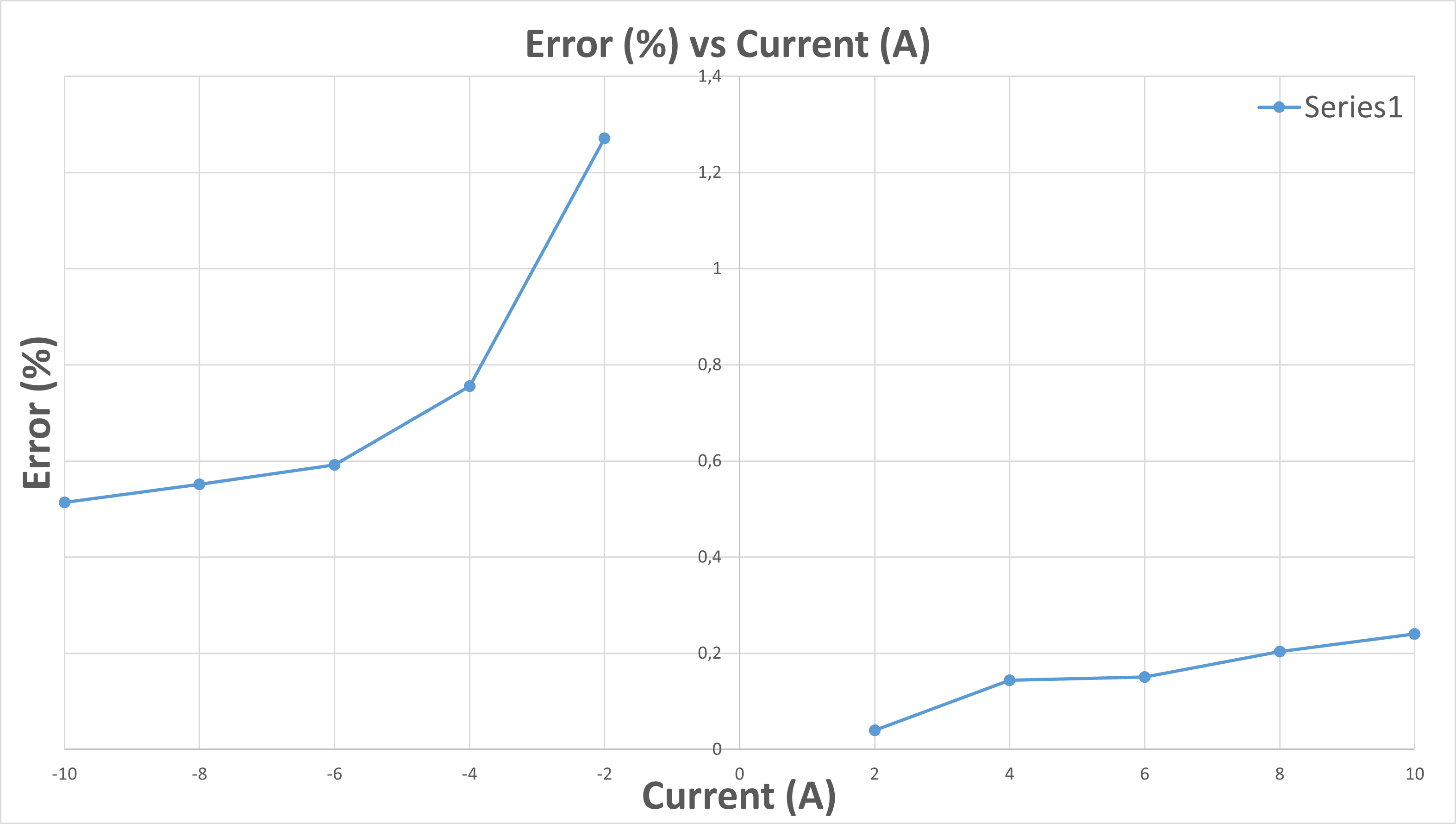 At positive currents the error remains below 0.3%, while at negative currents, the error increases slightly, peaking at -2 A, reaching approximately 1.3%, and then decreases toward ~0.5% at -10 A.
