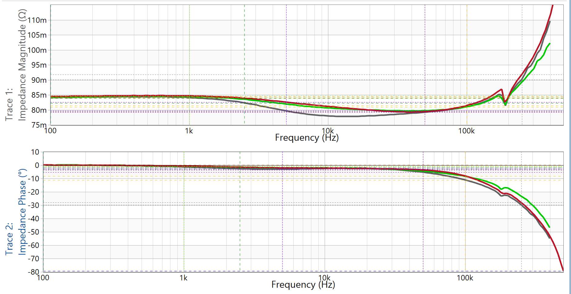 Overall, both sensors show stable impedance behavior up to approximately 100 kHz, matching the expected impedance values (~210 mΩ).