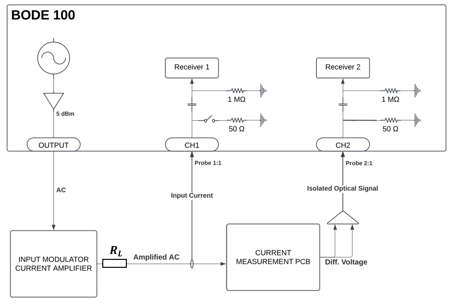 Fig. 289 Figure: Block diagram of AC impedance test setup using Bode 100, Spitzenberger APS 1000 (Input Modulator Current Amplifier), load resistor and optical probes.#