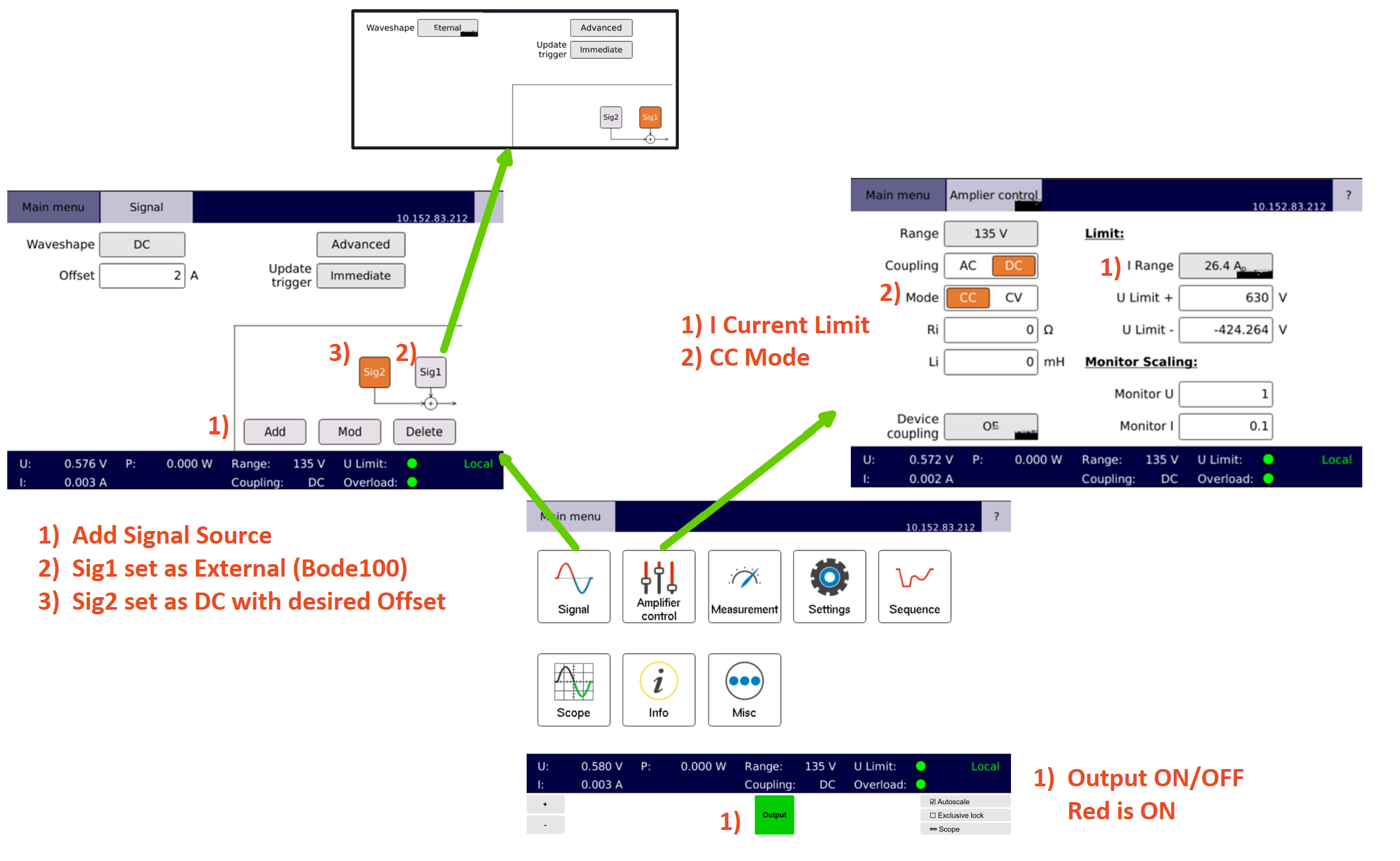 The Spitzenberger APS 1000 must be set to external source mode, where it amplifies the signal from the Bode 100 output rather than generating its own. Ensure the AC IN input of the APS 1000 is connected to the Bode 100 output, and internal signal generation is disabled. This setup allows the Bode 100 to control the frequency sweep, while the APS 1000 injects the corresponding amplified current into the analog current measurement card.
