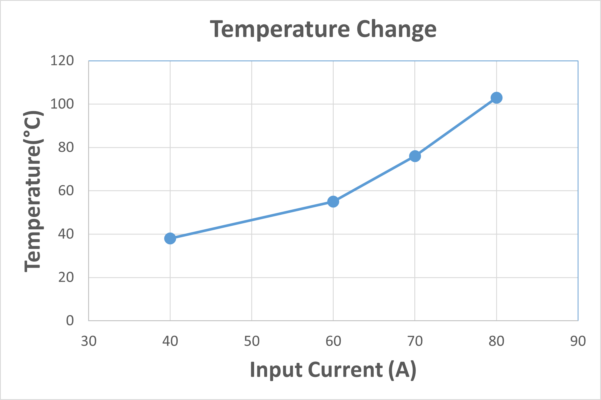 The thermal behavior of the PCB was evaluated by applying increasing DC input current on a single phase of the primary side and measuring the surface temperature using a thermal camera. The temperature values shown in the plot below represent the hottest point observed on the PCB during each test step. The heat distribution across the primary phase trace was found to be spread relatively uniformly. As shown in the graph, at an input current of 80 A (DC), the PCB reaches a surface temperature of approximately 105 °C. Therefore 80 A should be considered as the upper limit of the current capabilities of PCB.