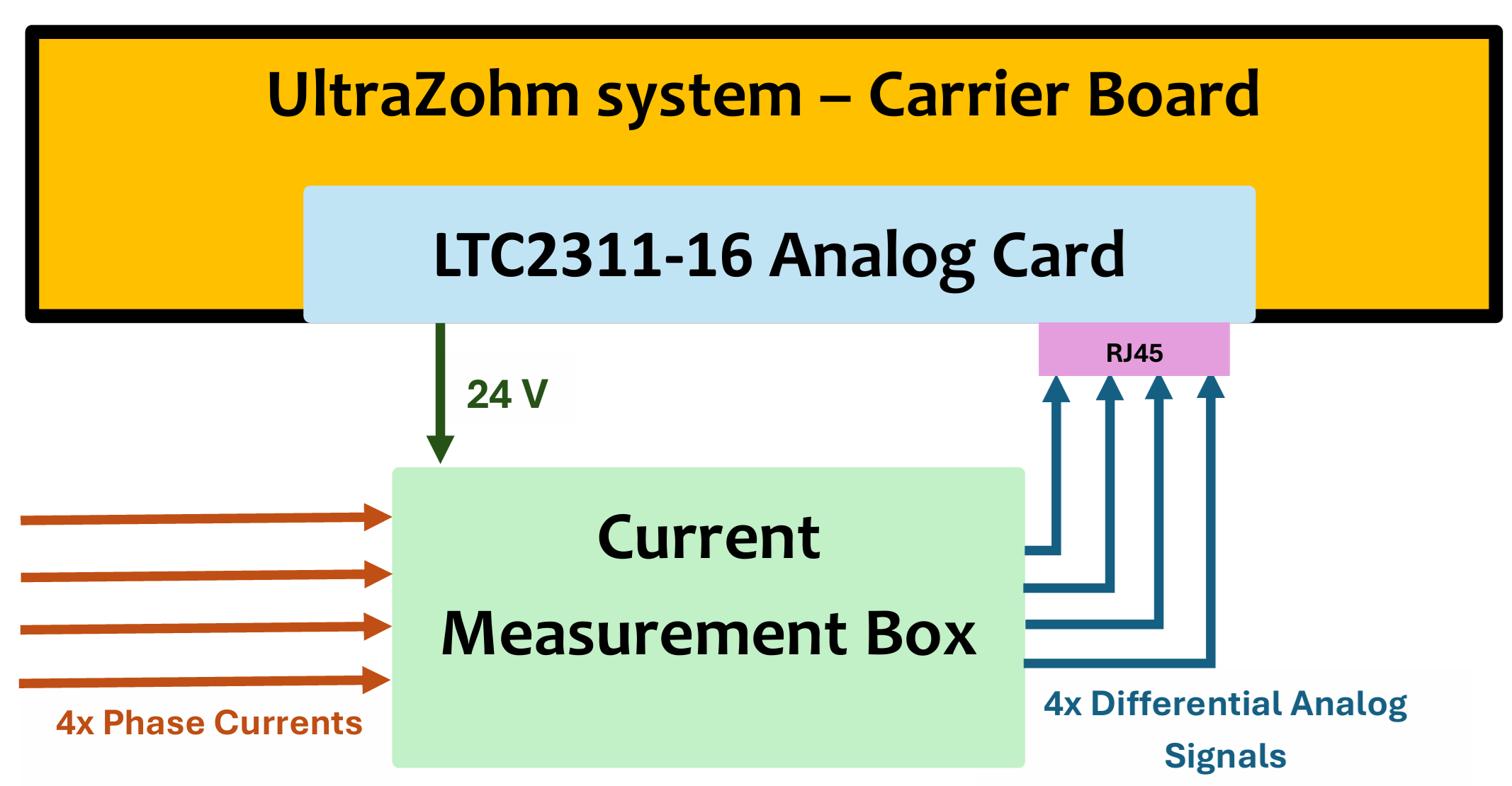 Block diagram showing the signal and power flow between the UltraZohm system carrier board, current measurement box, and the LTC2311-16 ADC card.