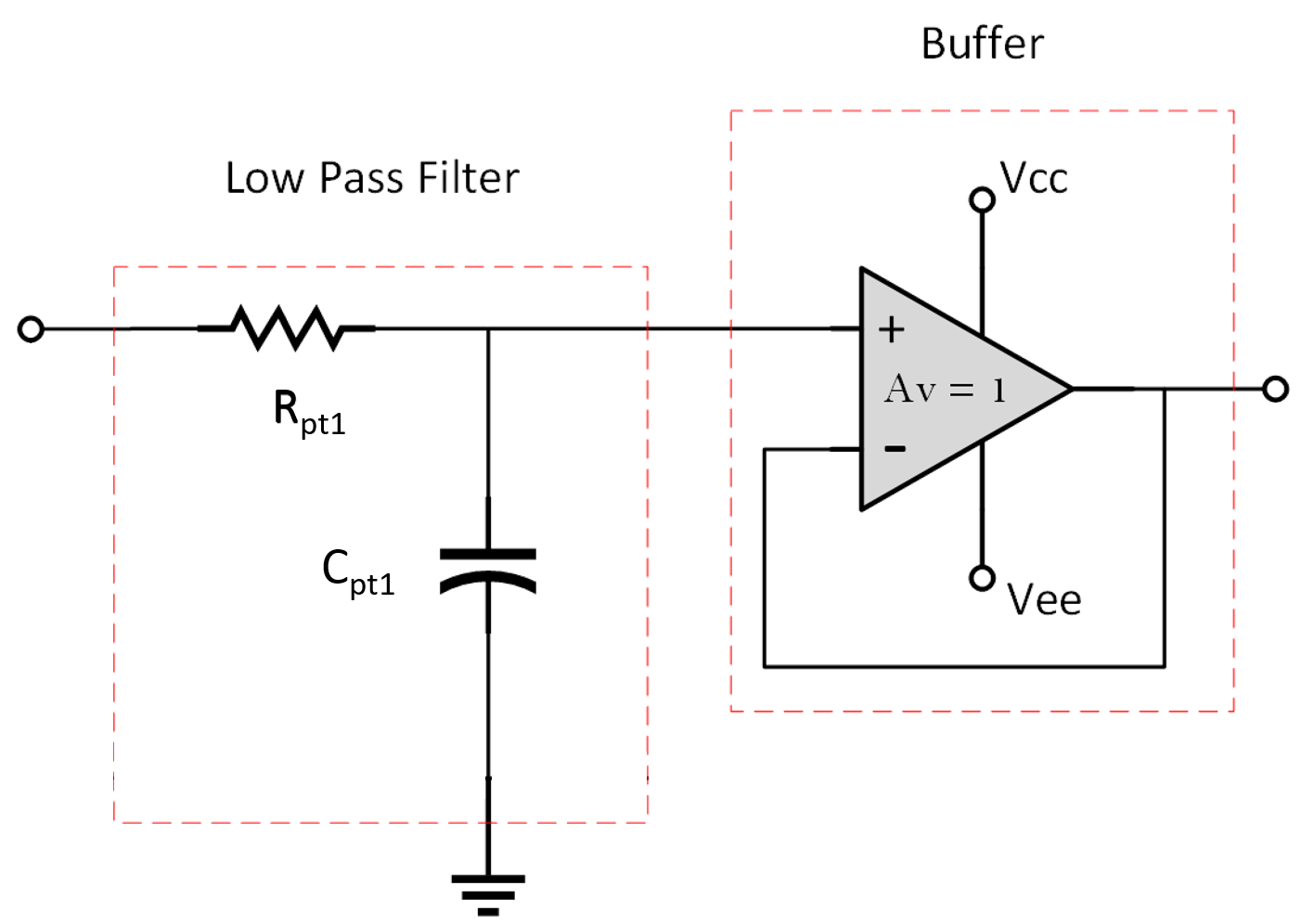 1. The front-end filter is necessary to protect the subsequent impedance converter from exceeding the voltage rails due to EMC peaks. The crossover frequency \(f_\mathrm{aliasing,-3dB}\) of the frond-end first-order low-pass filter is formed by the capacitor \(C_\mathrm{pt1}\) and the series resistor \({R_\mathrm{pt1}}\) with