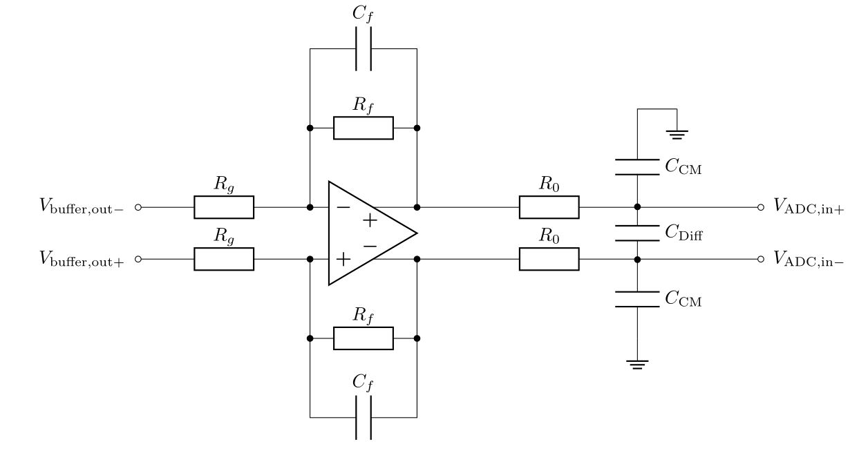 3. The crossover frequency \(f_\mathrm{aliasing,-3dB}\) of the anti-aliasing filter is formed by the capacitors \(C_\mathrm{Diff}\) and \(C_\mathrm{CM}\). They create a first-order low-pass filter with the series resistors \({R_0}\) with
