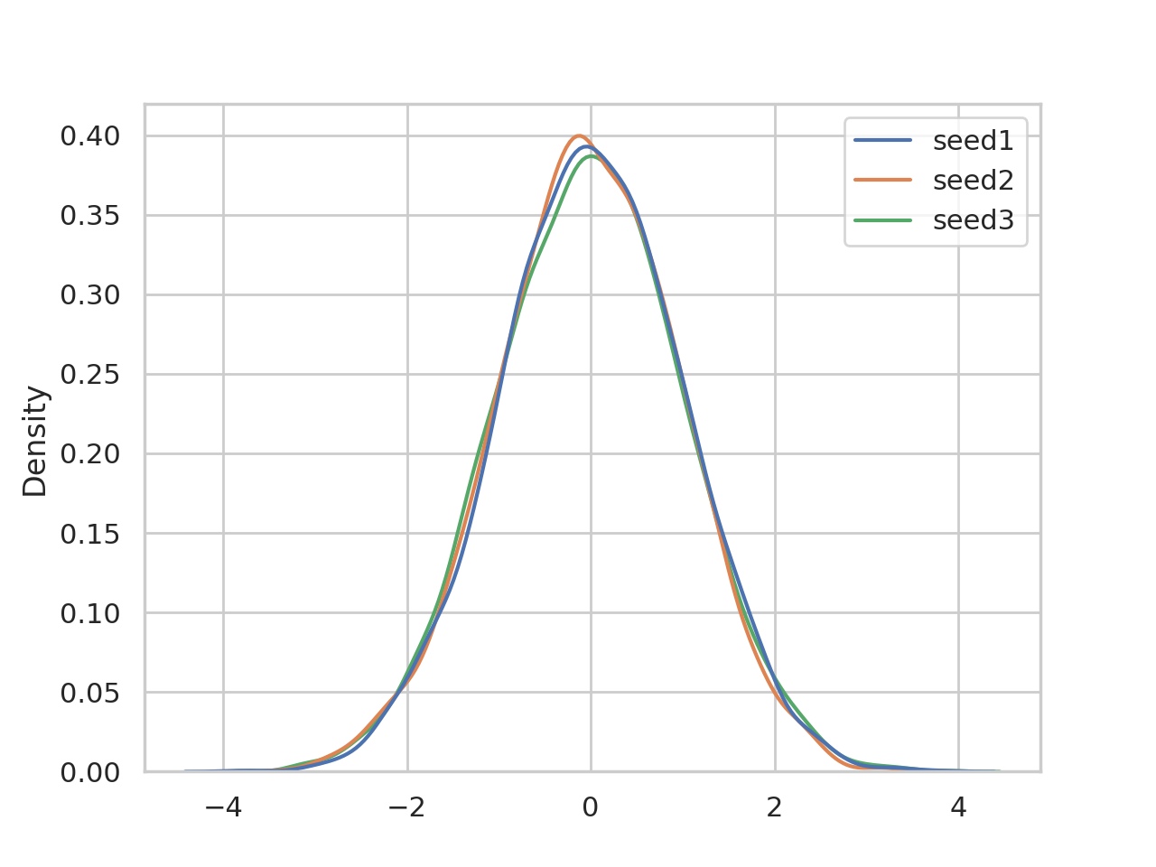 Fig. 357 Density distribution of 5000 samples generated by uz_prng_get_normal_float using uz_prng_generator_squares as PRNG. Comparison of three different random seeds.#