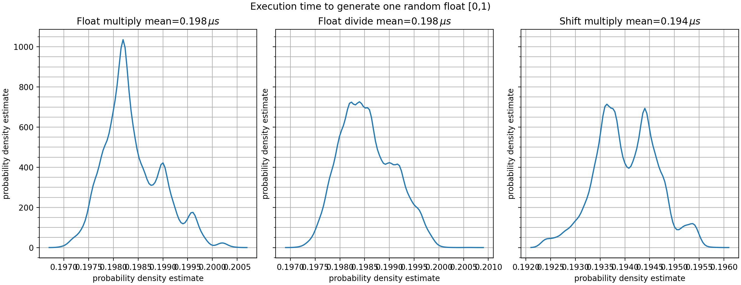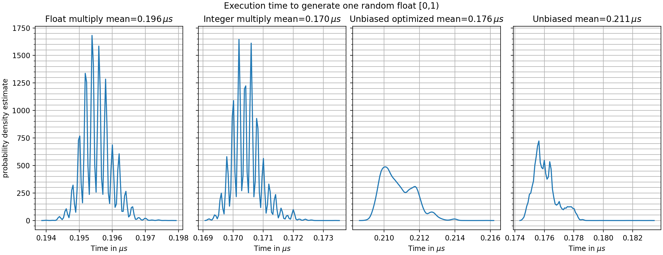 The following table shows the calculation time of calling uz_prng_get_uniform_float_zero_to_one once and compares the different settings of uz_prng_float_scale_method.
