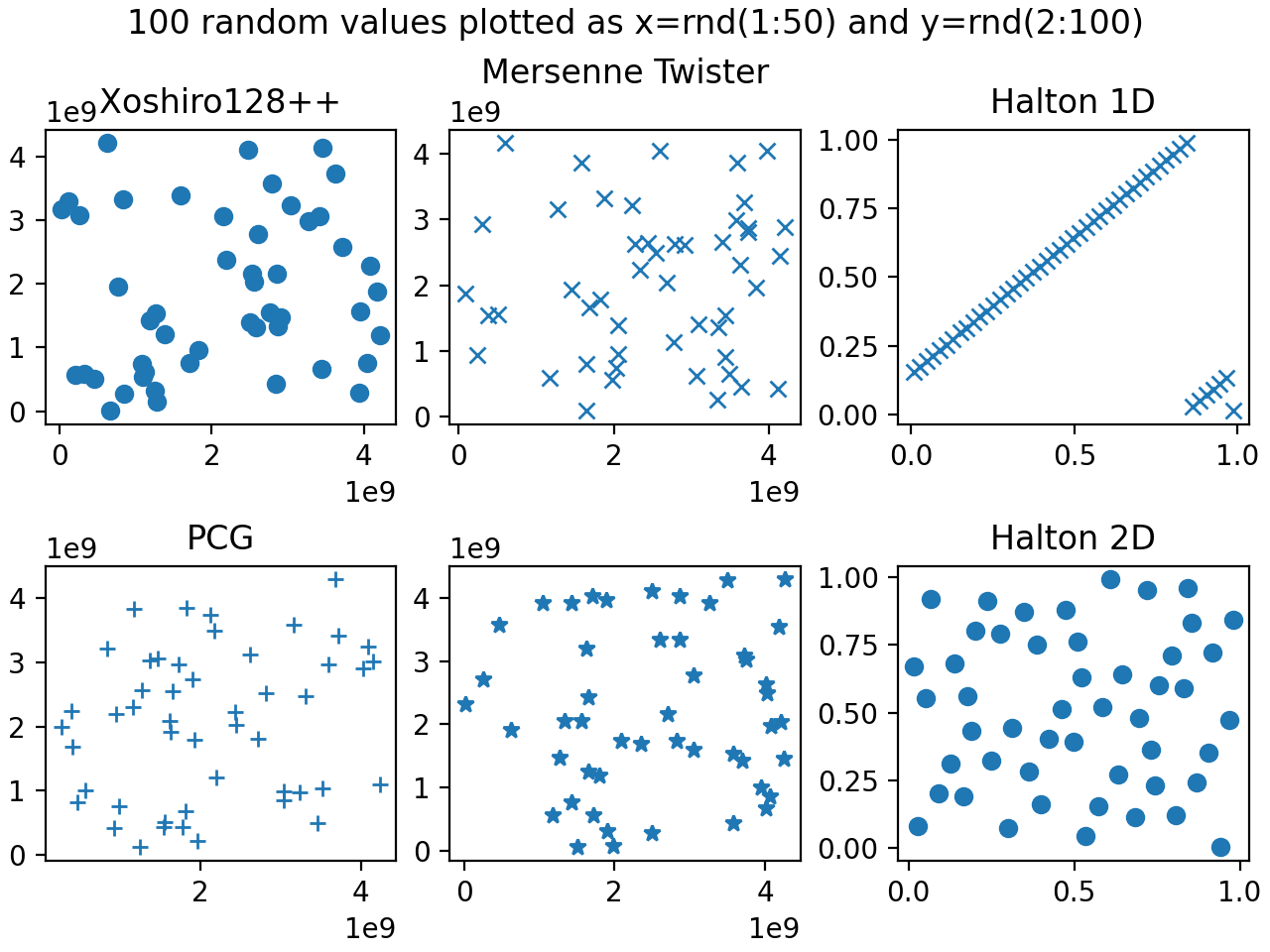 The following figure shows the generated distributions of different PRNGs in the 2D case.