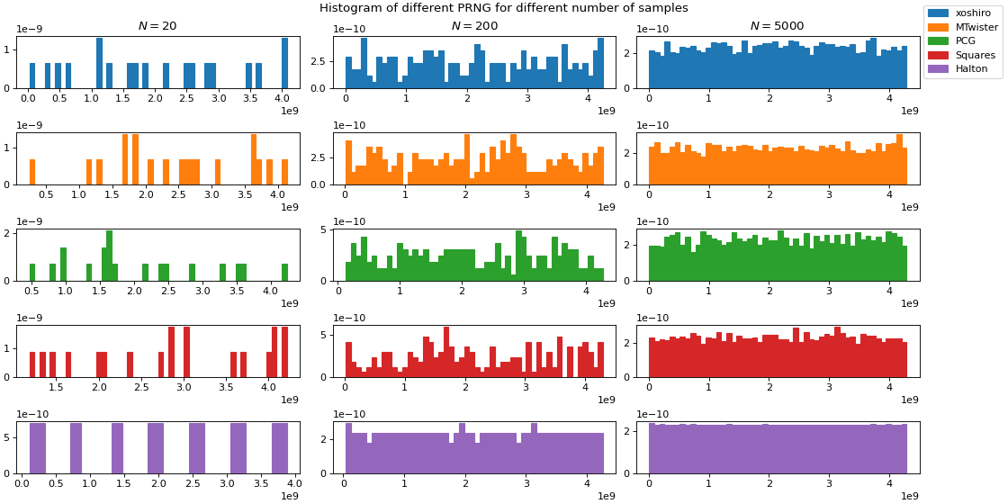 Fig. 349 Histogram for different numbers of samples taken from the implemented generators. Samples are generated using uz_prng_X_get_uniform_uint32, where X is the name of the specific generator. For an increasing number of taken samples, the distribution tends towards uniform data. However, for a small number of samples, the generated random numbers can deviate from a uniform distribution considerably (as is the case with real randomness, i.e., law of large numbers). As can be seen, the Halton sequence produces uniformly distributed values already for a low number of samples.#