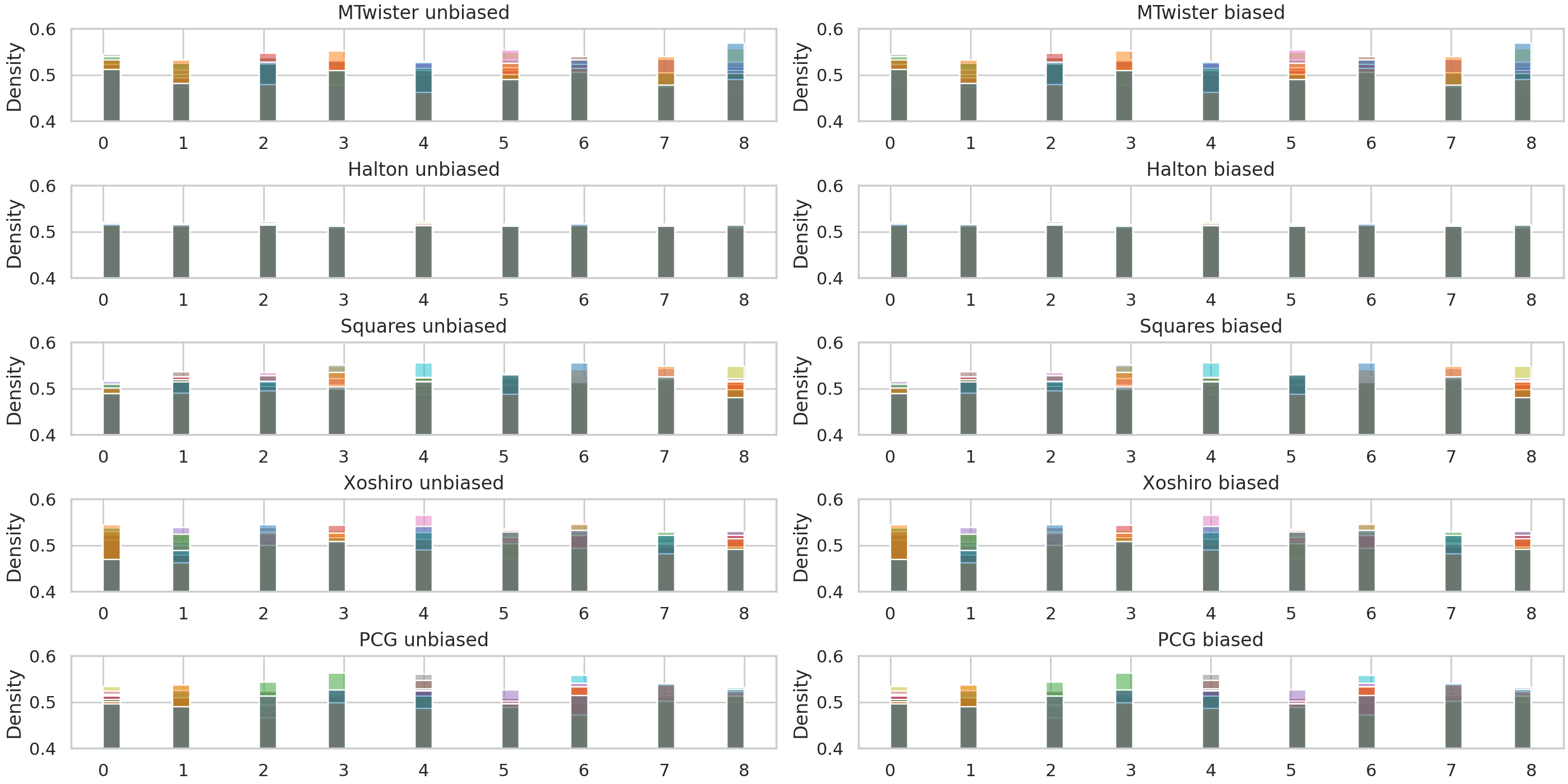 The following figure highlights the dependency of the different generators on the random seed. A sample of 5000 values is taken from each generator for ten different random seeds. As can be seen, the specific distribution generated varies for the given seed and the used generator.