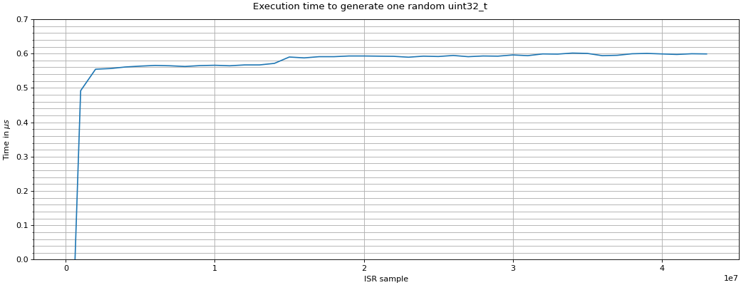 The measurement is based on generating 20 values per ISR over 4000 ISR cycles by calling uz_prng_get_uniform_uint32_zero_to_uint32_max.