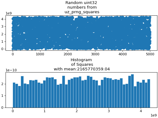 The following figures shows the generation of 5000 random numbers using Xoshiro128++ generator. Additionally, the Histogram of the generated values is shown. The generated random values are uniformly distributed, but not in a perfect manner. The specific pattern and distribution depends on the random seed.